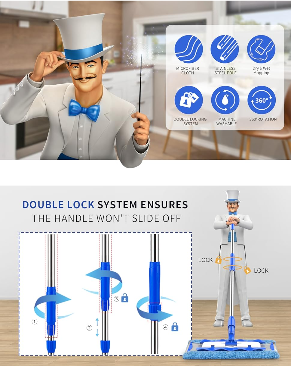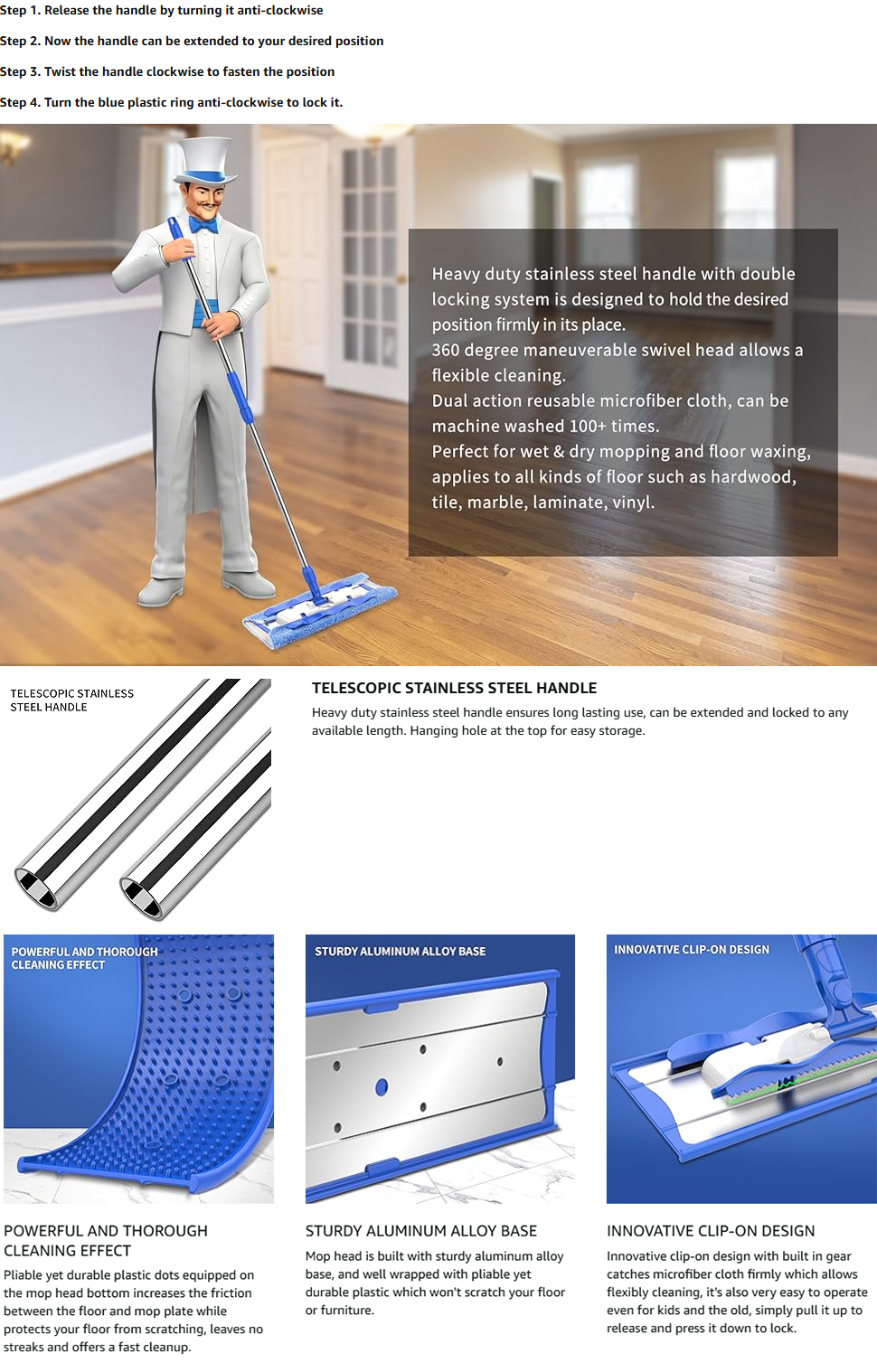- DOUBLE LOCK TELESCOPIC SYSTEM - Stainless steel adjustable handle can be extended and locked to any available position, which offers a comfortable pickup and hold for different person, makes cleaning the floor without having to bend down. Heavy duty stainless steel handle with double lock system is designed to hold the desired position firmly in its place, so you don't have to worry the pole will slide down while mopping