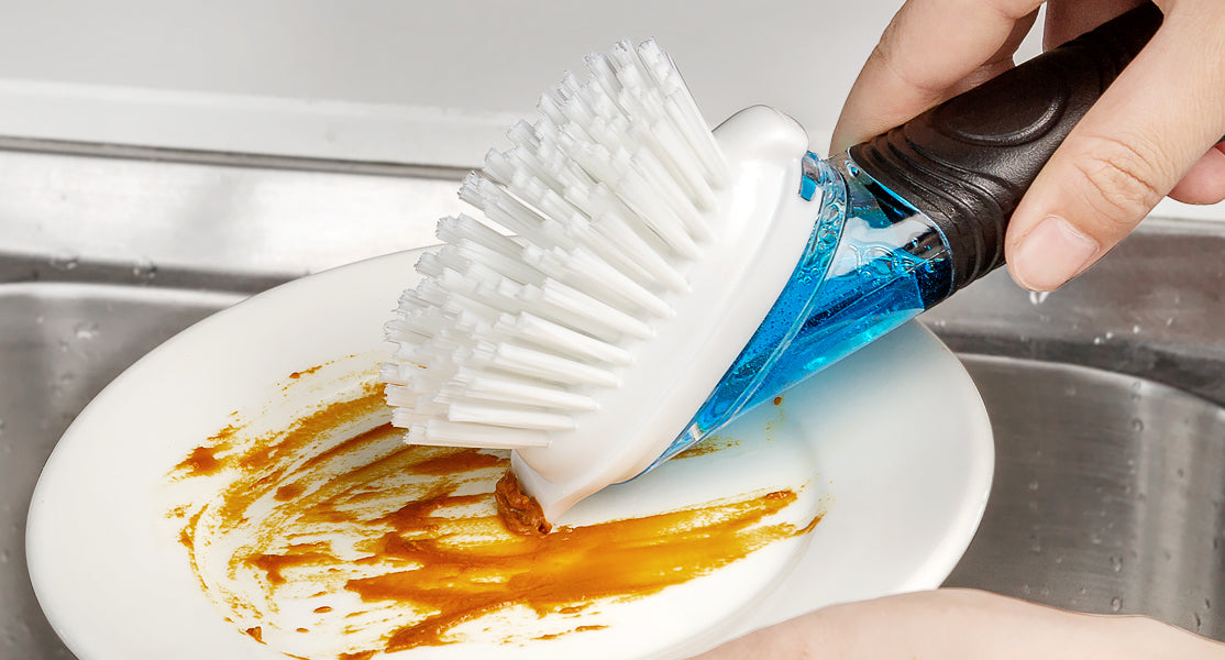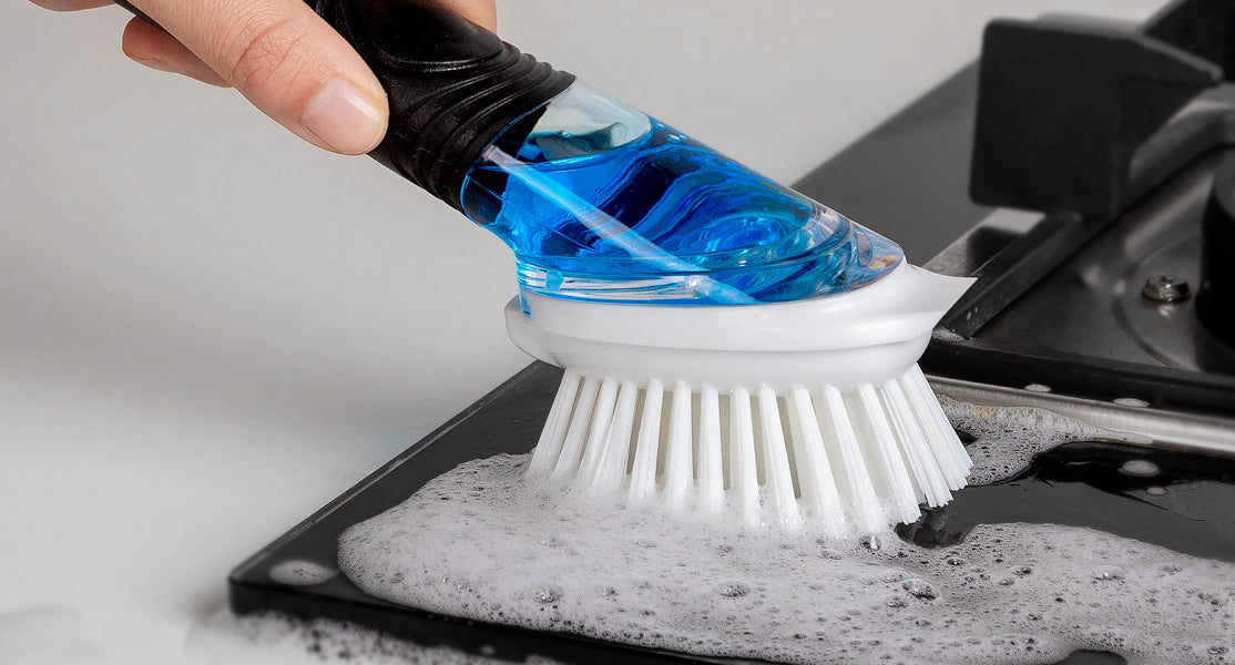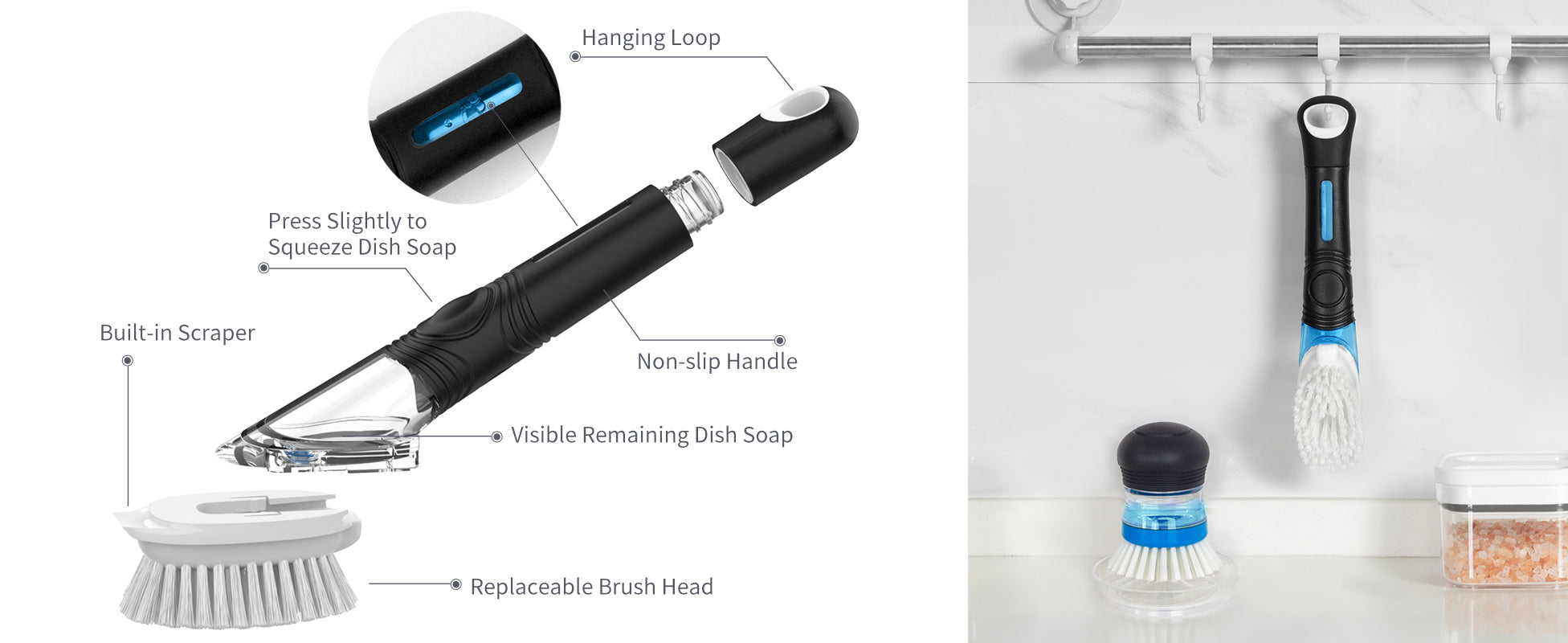Soap Dispensing Dish Brush Storage Set-they are durable enough to scrub dirt effectively yet gentle enough to use on non-stick cookware. Built in scraper on brush head backside easily removes stuck-on food