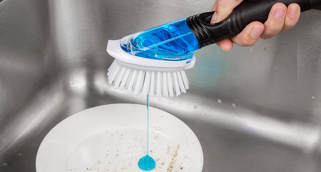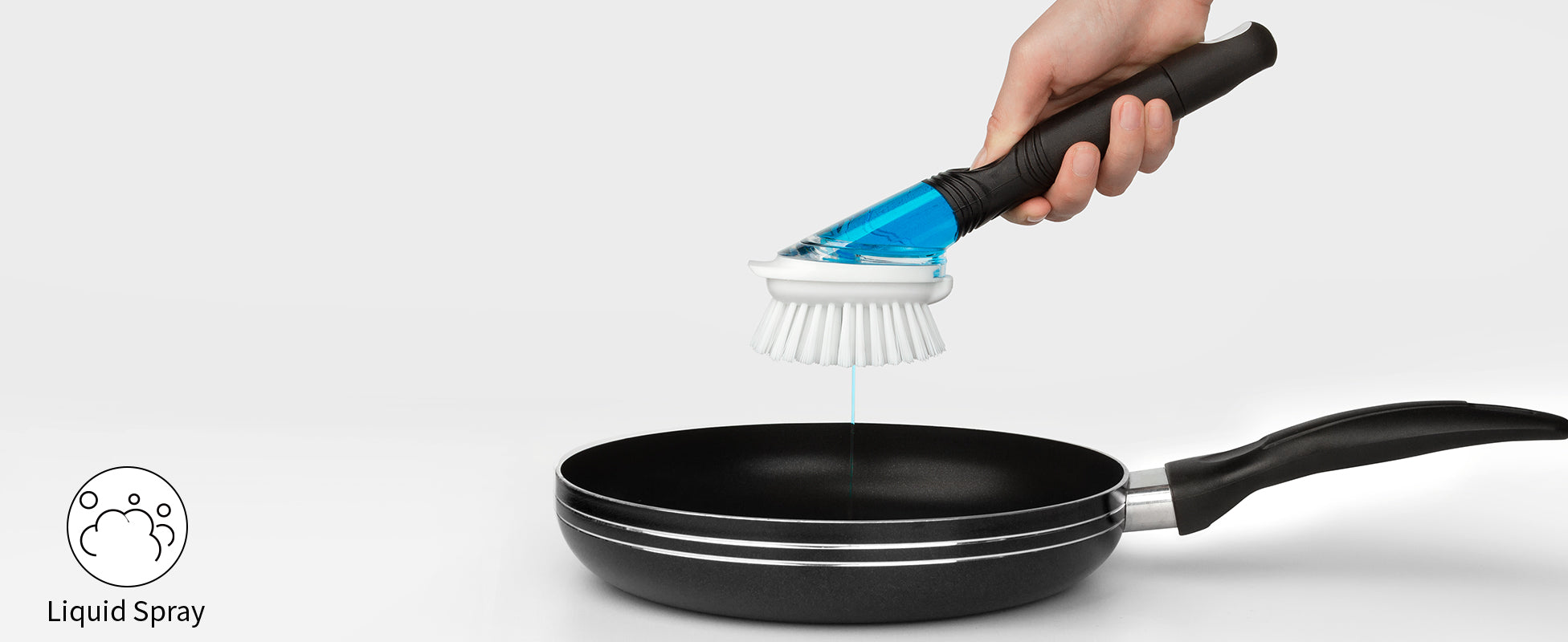 - COMFORTABLE GRIP: Designed with a non-slip and ergonomic handle which fits comfortably in hand even when wet and soapy. The handle can be easily filled with your favorite dish soap for 70 ml. To start cleaning, simply press the button and it squirt dish soap directly.