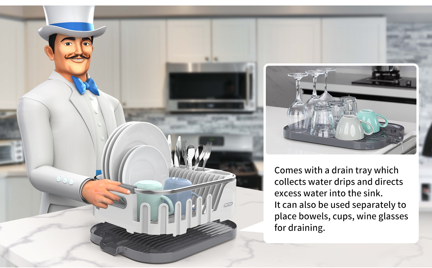 - DURABLE CONSTRUCTION: MR.SIGA muti-functional dish drying rack is constructed of durable plastic and rust proof aluminum frame, includes dish drying rack and a detachable drainboard. This dish drying rack is available in 3 colors: White(ASIN B09CDWVY41), Black(ASIN B09CFXDQCS) and Gray (ASIN B09CDT1M38).