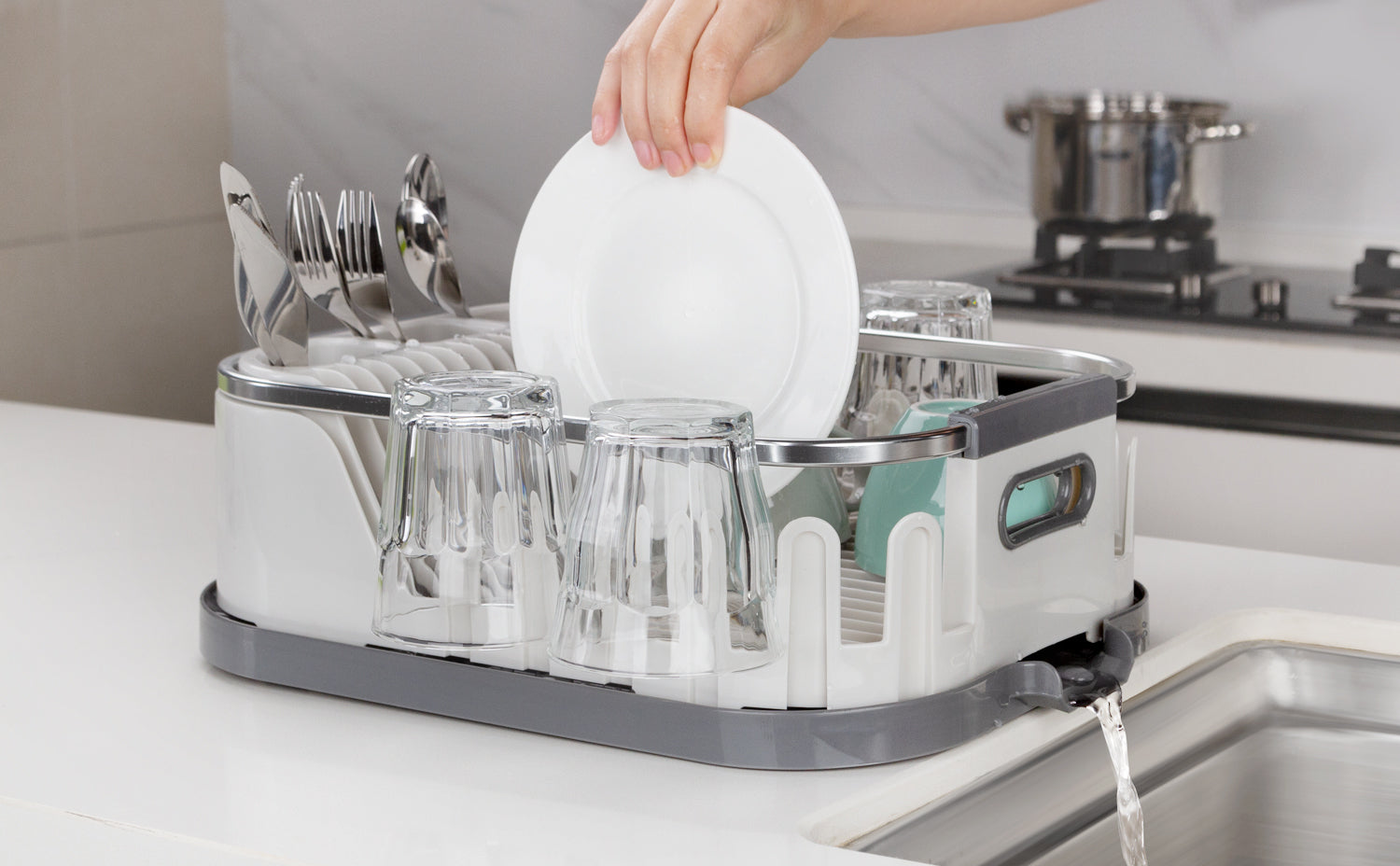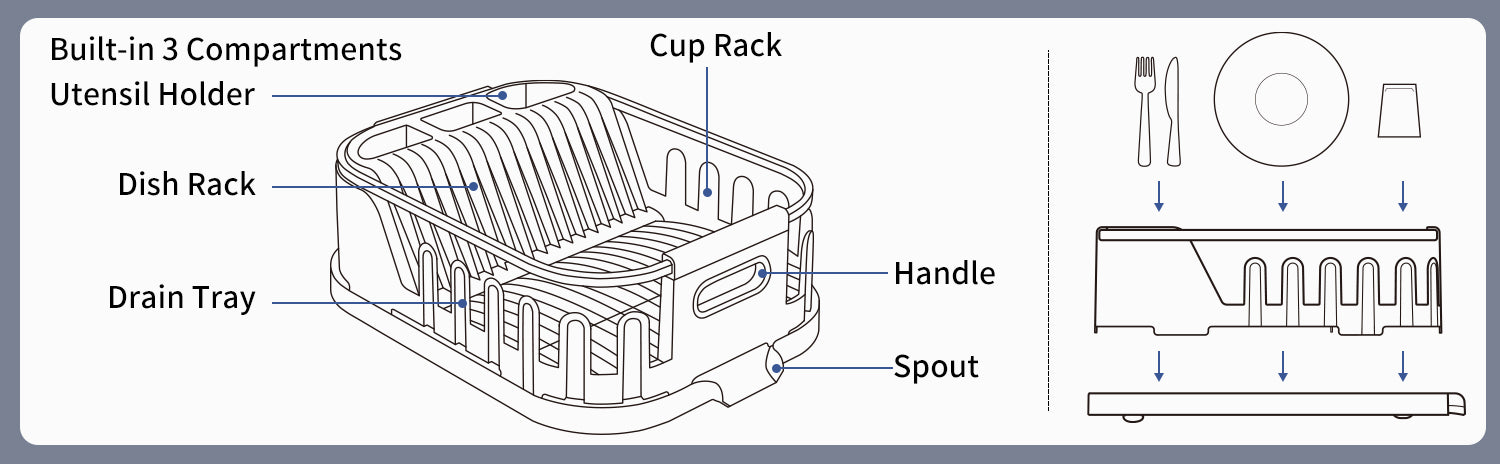 - DETACHABLE & EASY DRAINING: Drainboard is removable and can be used individually. Bottles, cups, water glasses can be drained on the tray easily, while the dish rack is great for drying dishes, bowls, utensils, mugs, flatware with a dish drying mat under the drying rack.
