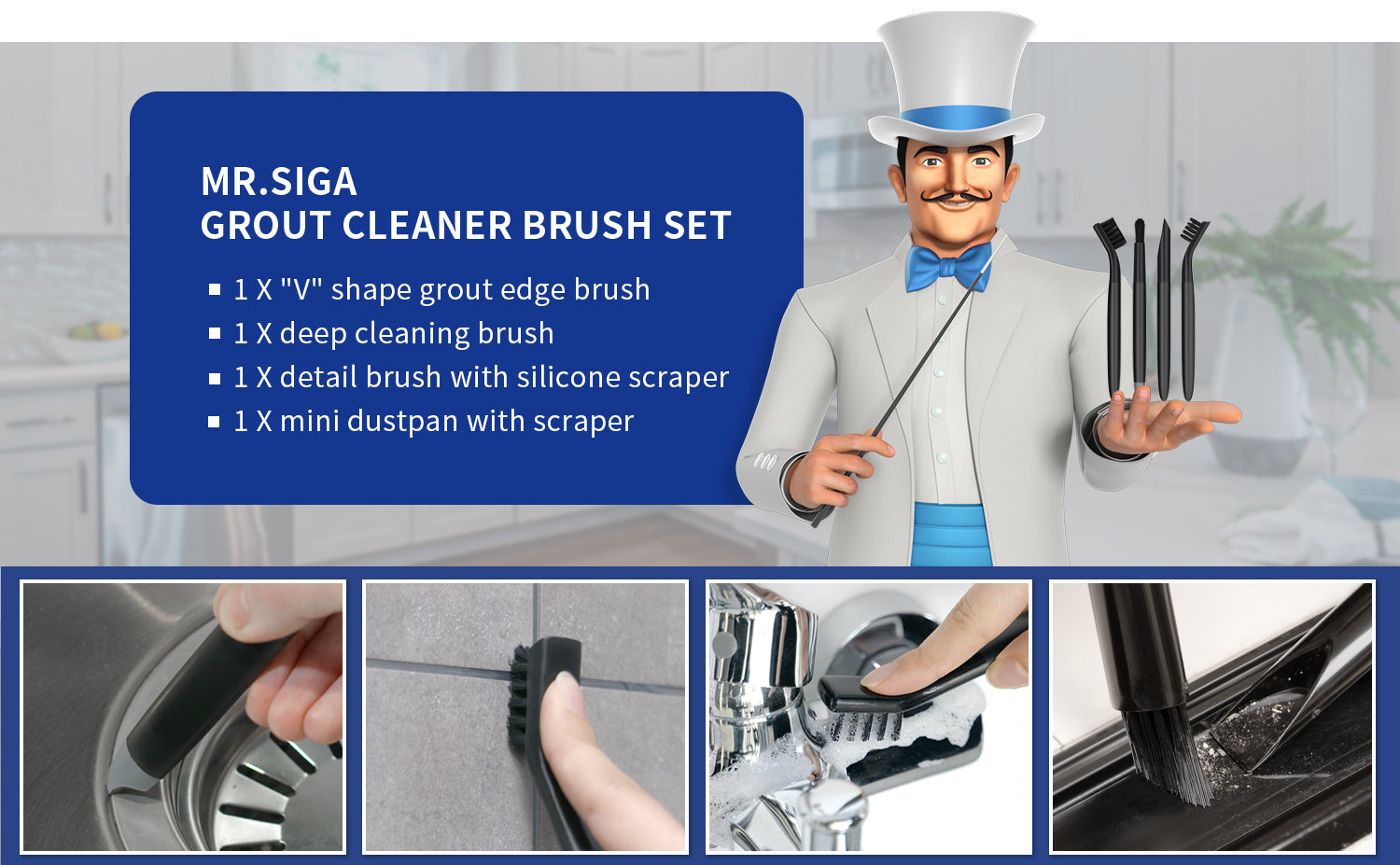 - MR.SIGA grout cleaner brush set contains: 1 "V" shape grout edge brush, 1 deep cleaning brush, 1 detail cleaning brush with silicone scraper, 1 mini dustpan with scraper, it's a must-have grout scrub brush set for your household cleaning.