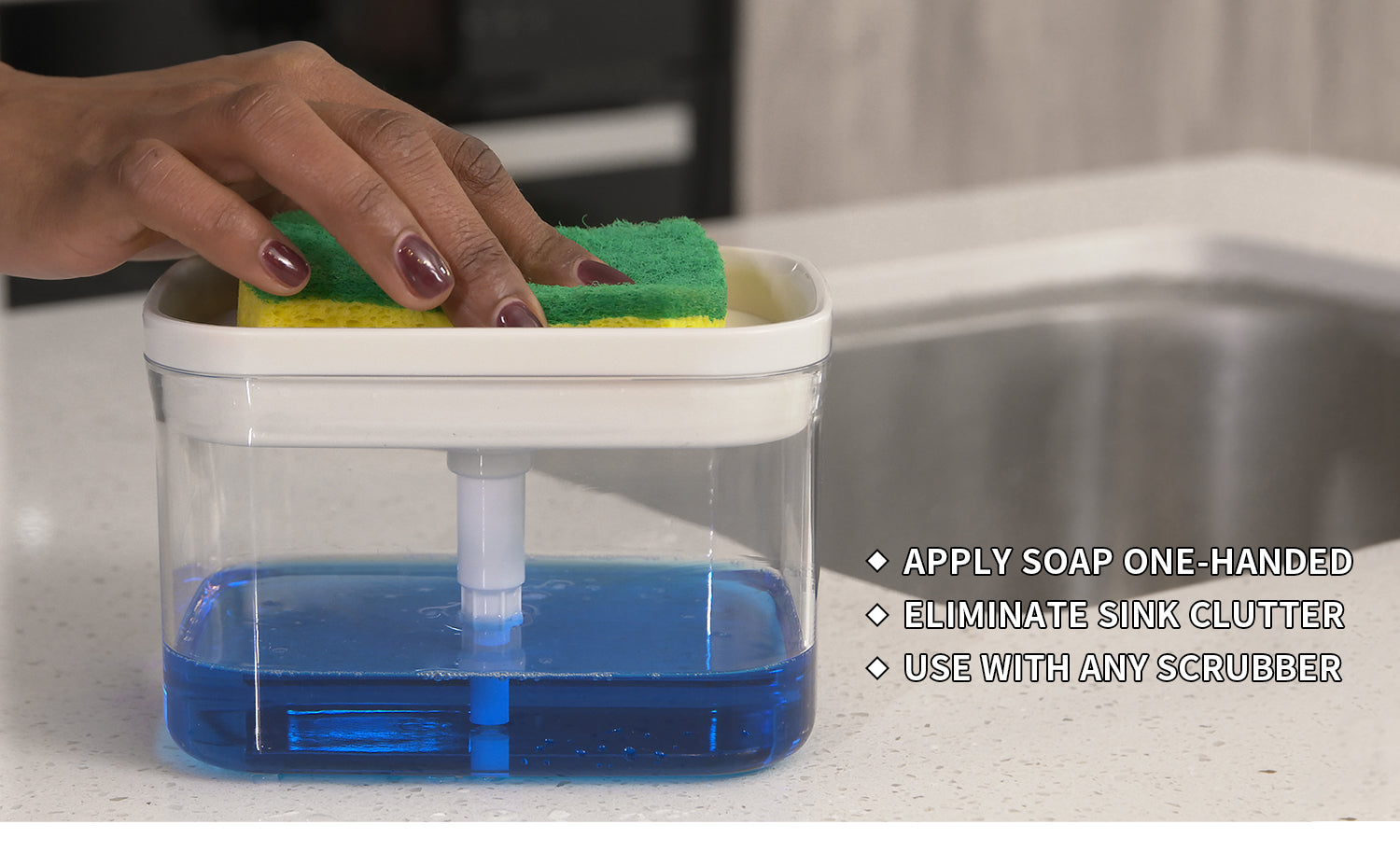 - ONE HAND EASY OPERATION: Fill the caddy with your favorite dish soap, gently press down on the tray to dispense soap directly onto the sponge with one hand, and it will dispense appropriate amount of soap onto the sponge so your soap won't be wasted. You can also use scouring pad, cleaning rag, scrubber instead of sponge.