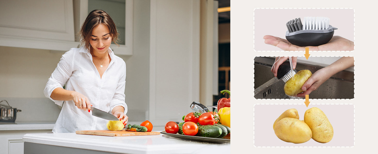 - COMBINATION OF DUAL ACTION BRISTLES: Features two different nylon bristles: angled gentle grey bristles for mushrooms, delicate produce, while stiff straight white bristles for scrubbing potatoes, radish, cucumbers and more.