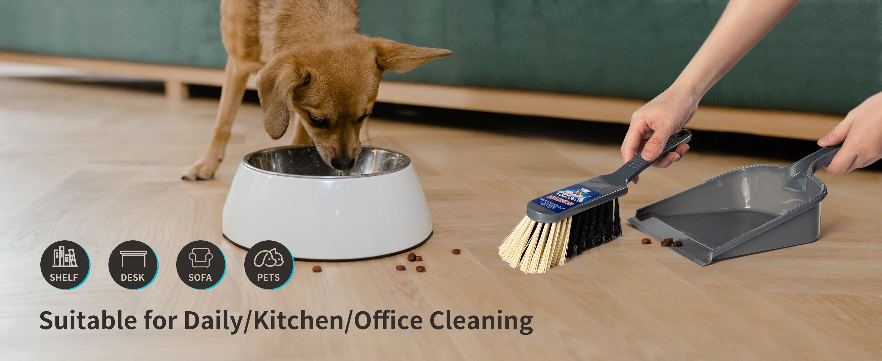 - Pack of 2 set, Blue & GreyHigh quality PET fibersBrush snaps into Dustpan for storageHigh wall design to keep debris inSoft rubber edge creates a flat surface