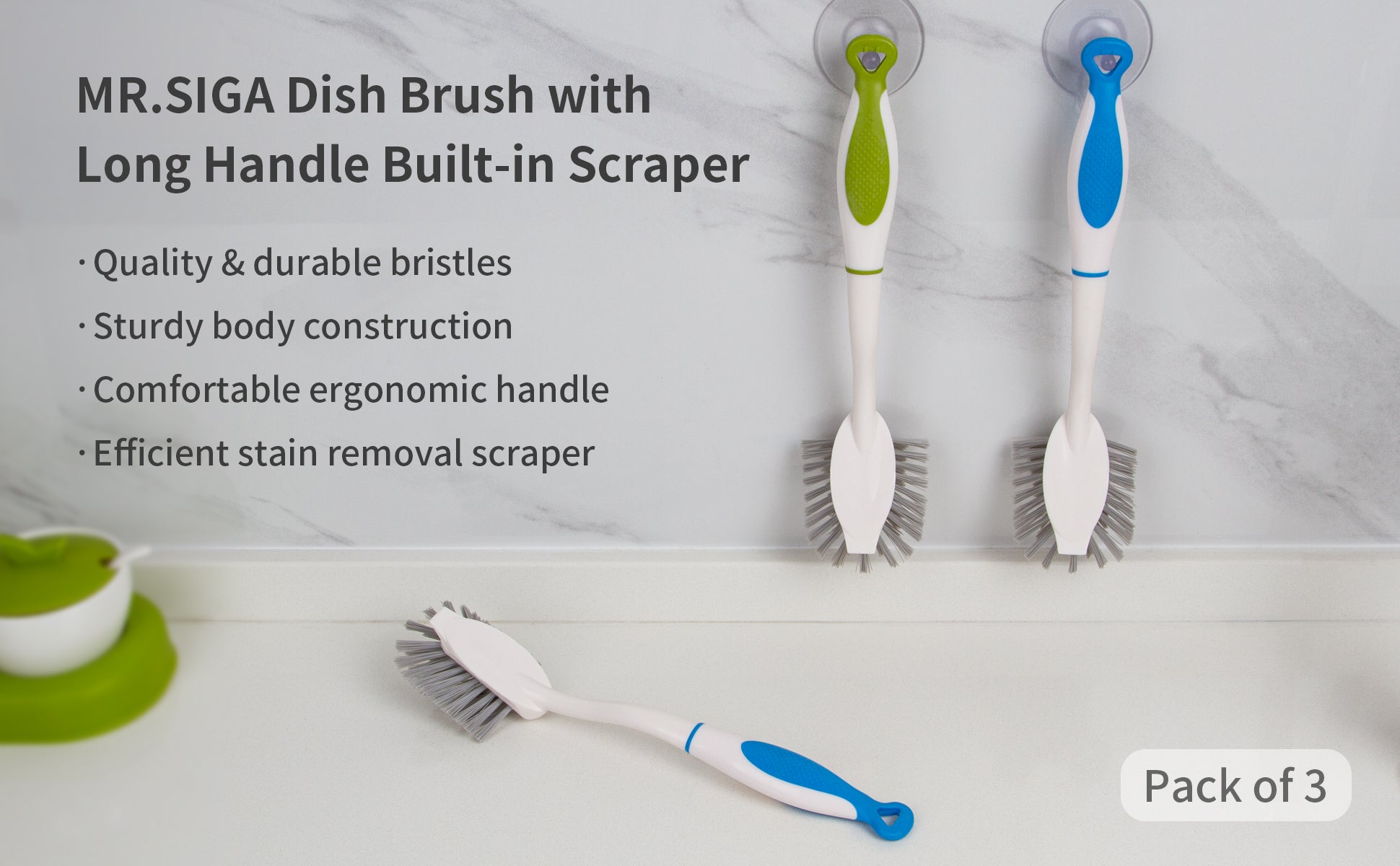 MR.SIGA Dish Brush with Handle Built-in Scraper, for Pans, Pots, Kitchen Sink Cleaning, Pack of 3