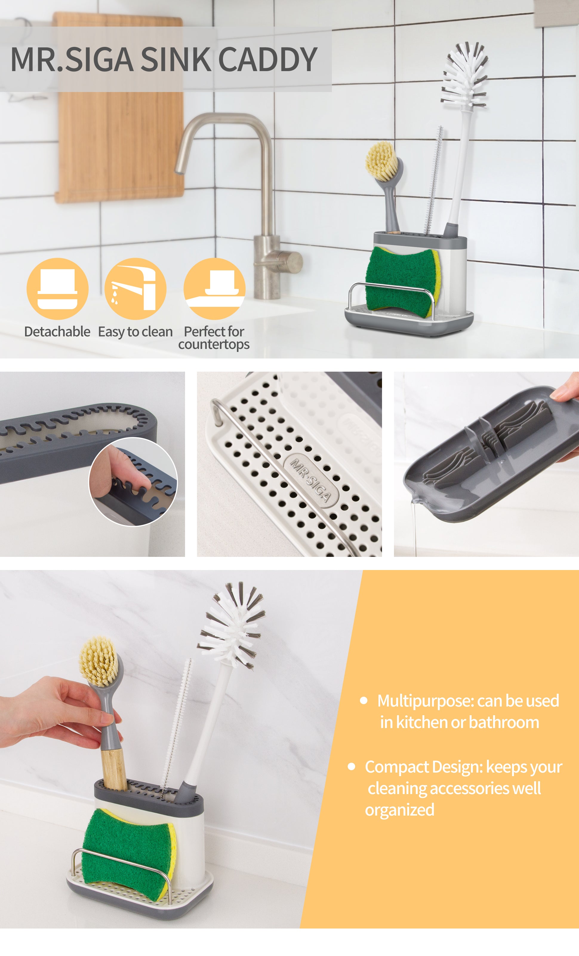MR.SIGA Sink Caddy, Kitchen Sink Organizer Sponge Brush Holder with Drip Tray, White & Gray