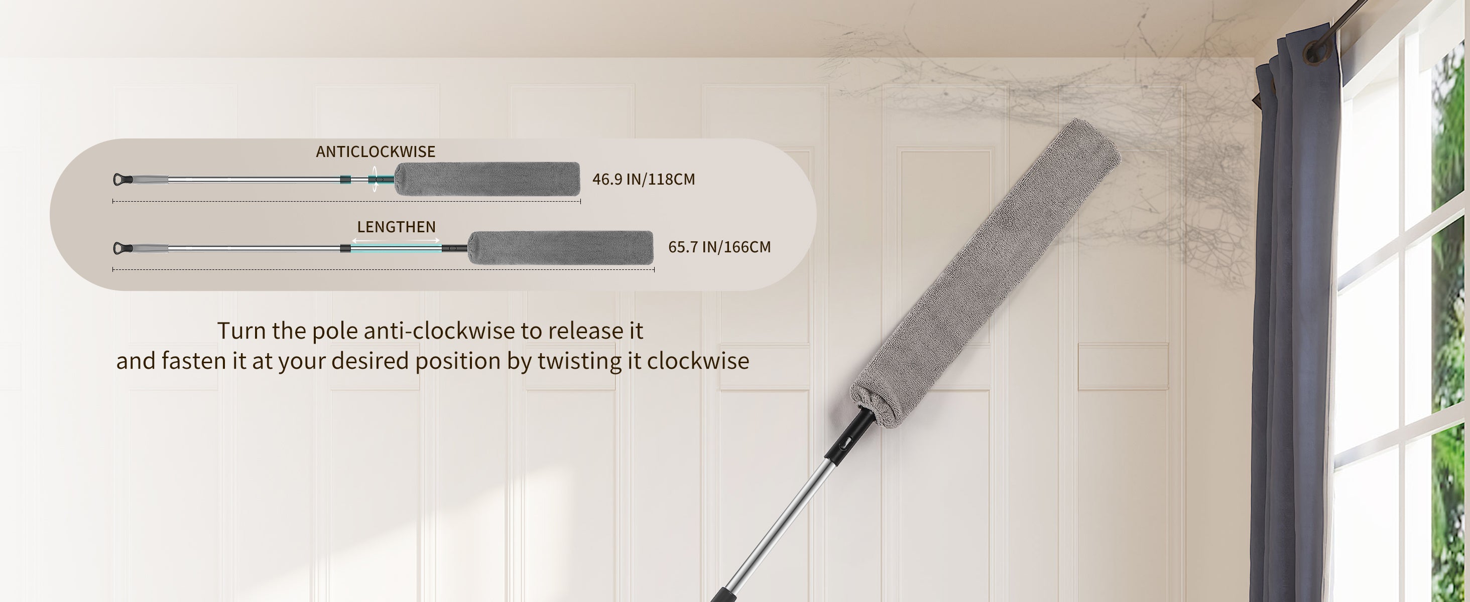 - EASY TO ASSEMBLE AND USE: - Simply insert the pole into the duster head connection until you hear a "click" sound to complete the installation. Turn the pole anti-clockwise to release it and fasten it at your desired position by twisting it clockwise. Great for cleaning ceiling, wall, underneath the bed, couch, furniture and more. Hanging loop for easy storage.
