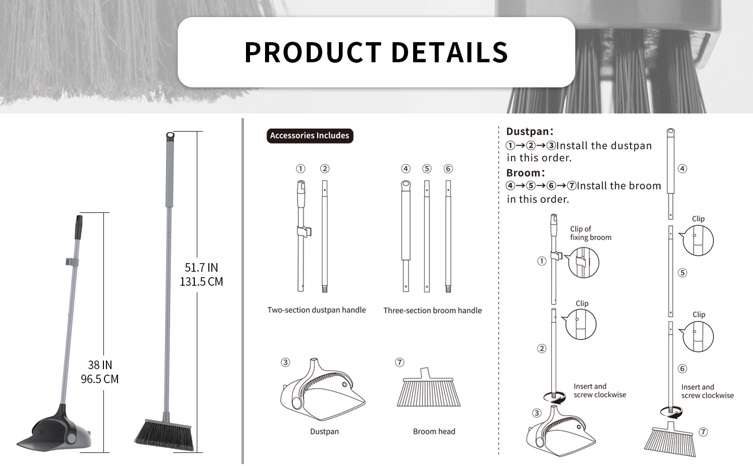 - 51.7 inches of long broom handle provides a easy cleaning of hard to reach places so it saves your back and knee. You can adjust the pole length to accommodate different cleaning jobs. Foam wrapped handle top fits comfortably and perfectly in hand, which offers a comfortable pickup and hold while sweeping