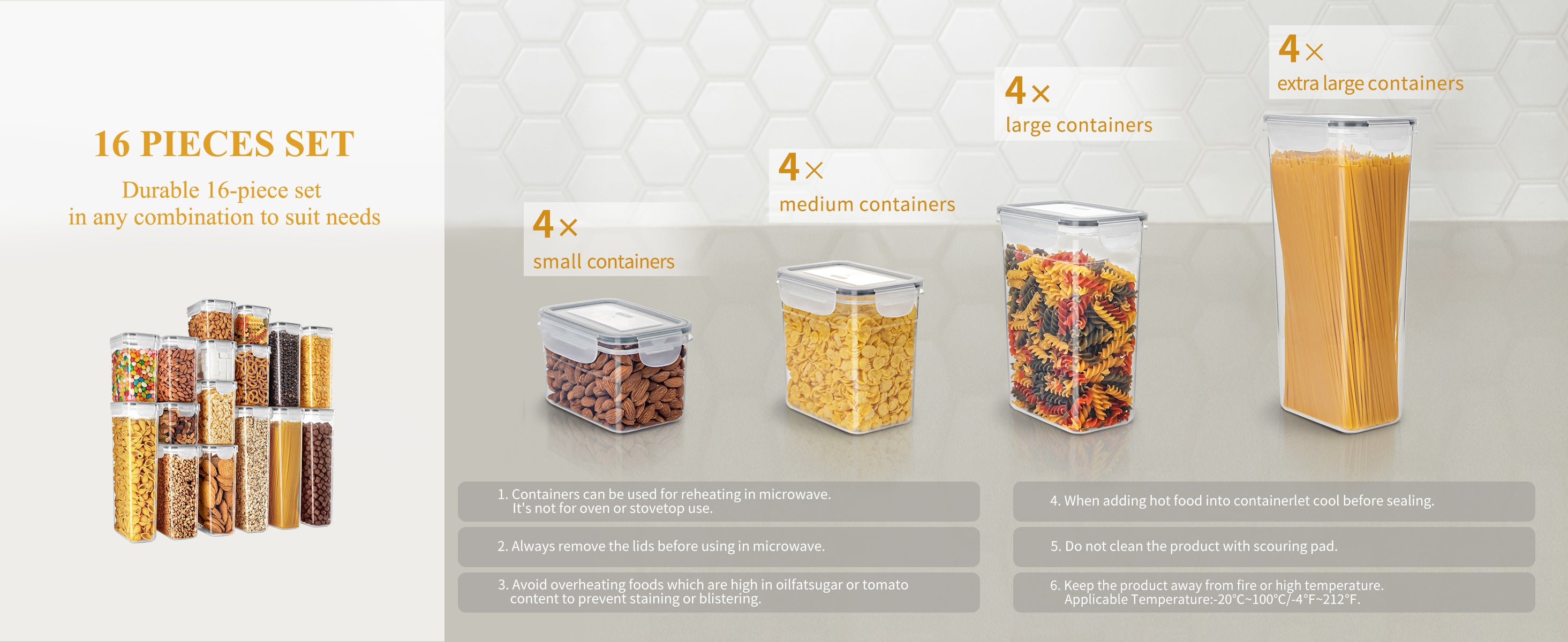 - 4 DIFFERENT SIZES COMBINATION: Perfect for storing snacks, dry fruits, cereal, pasta, pet food and more. The whole set includes 16 pieces storage containers: 4 x Extra Large(2.7 L/91 oz), 4 x Large(1.9 L/64 oz), 4 x Medium(1.3 L/44 oz), 4 x Small(0.8 L/27oz).