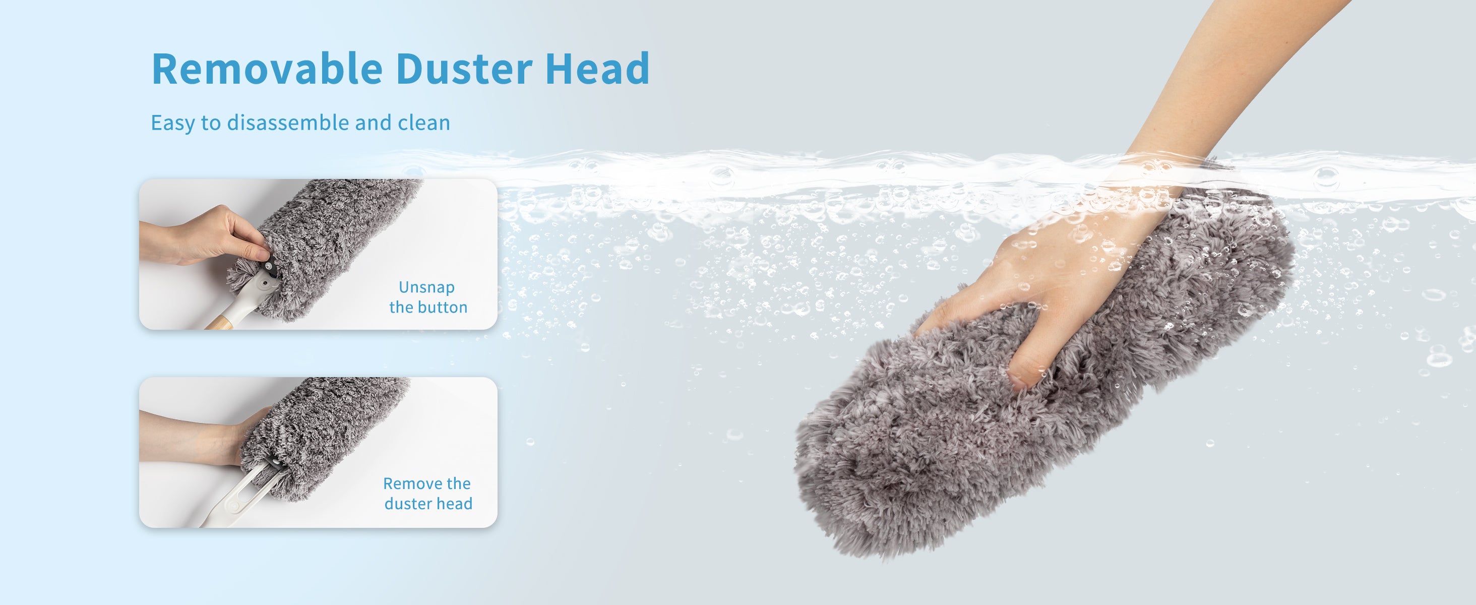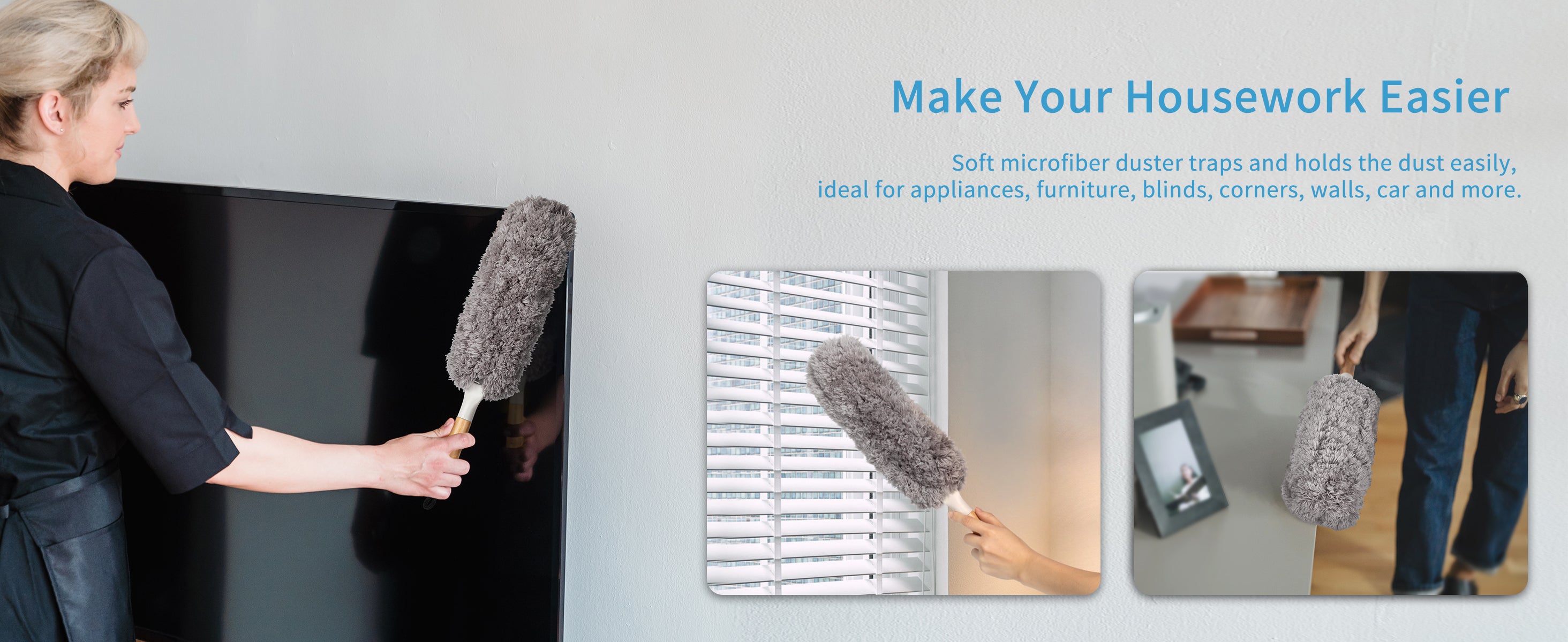 Microfiber duster features a fluffy microfiber head which covers a large cleaning surface, traps and holds dust like a magnet instead of pushing it around.