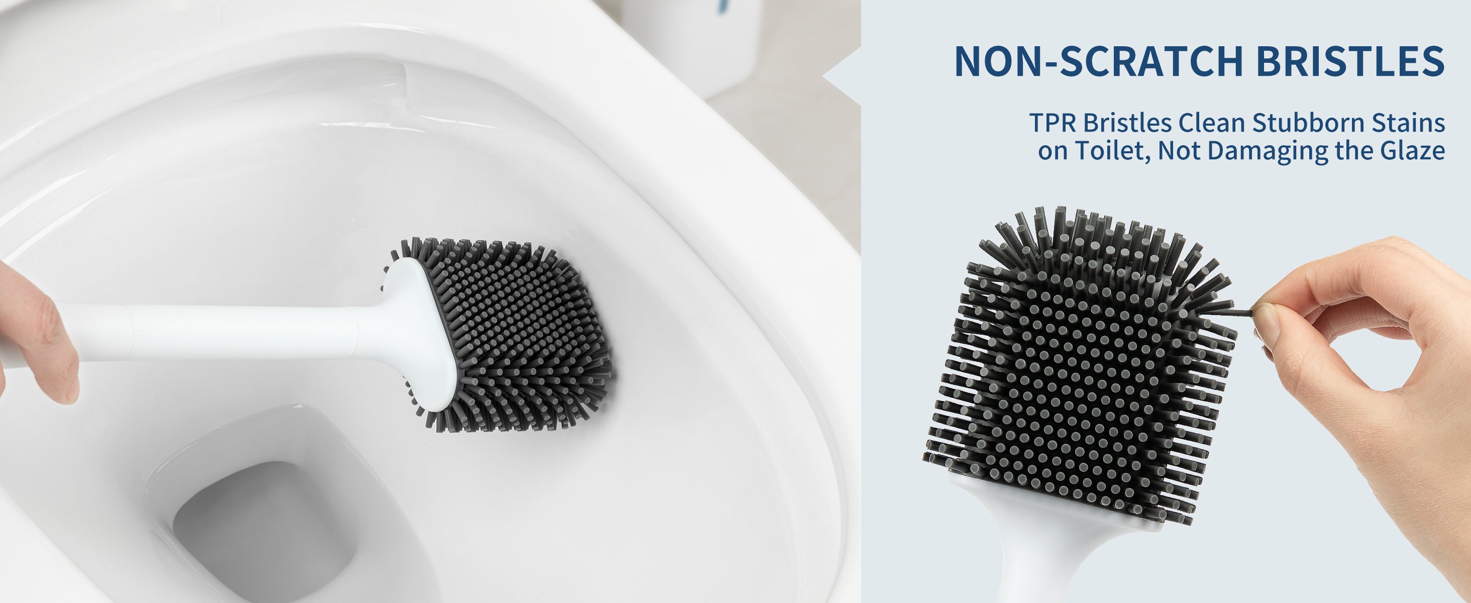 - SANITARY and EFFICIENT CLEANING. Strong TPR bristles are not easy to get deformed which remove stains easily, the flat shaped brush head with dense TPR bristles offer thorough and deep cleaning for under-rim area and those hard-to-reach corners.